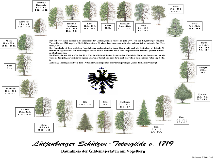Die starke Eiche, die mächtige Buche, der langlebige Ölbaum oder der robuste Apfelbaum galten den "wilden" Kelten als Heiligtümer. Zu bestimmten Tagen oder Zeiträumen, die mit den Mondzyklen und den Jahreszeiten zusammenhingen, verehrten und würdigten sie diese Bäume. Durch den natürlichen Rhythmus der Jahreszeiten ordneten sie im Lauf der vielen Jahre bestimmten Bäumen feste Zeiten und Anlässe zu.